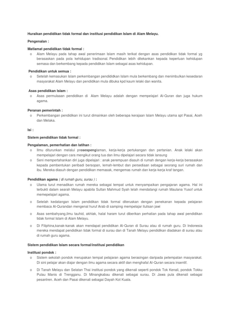 Huraikan Pendidikan Tidak Formal Dan Institusi Pendidikan Islam Di Alam Melayu Pdf